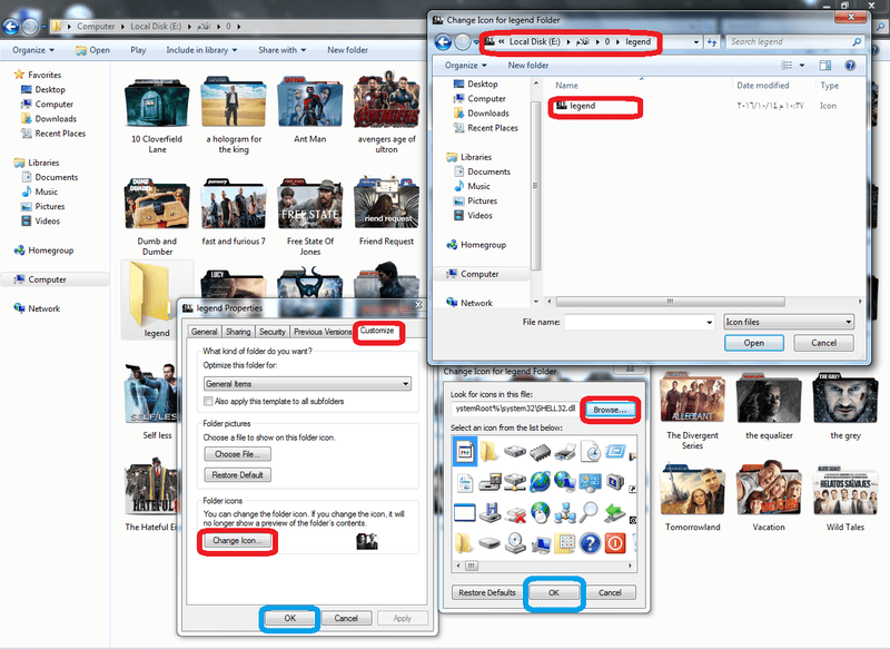 • ستظهر لك قائمة إختر منها Customize ومنها أختر من الأسفل Change Icon ستظهر لك نافذة أخرى أختر منها Browse.. ومن النافذة الأخيرة إذهب للملف الموجود به الايقونة وقم بإختيارها ثم ok ثم ok والان انتهيت: